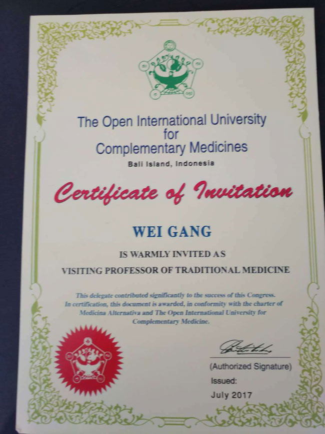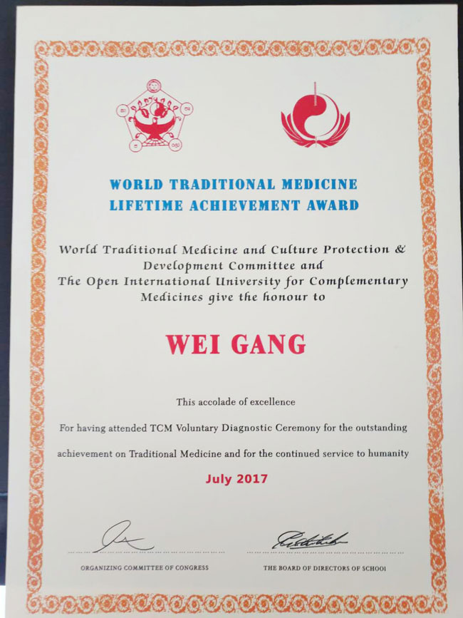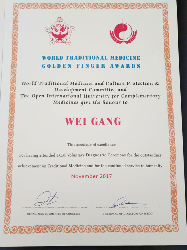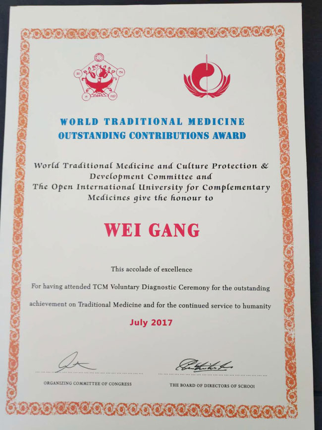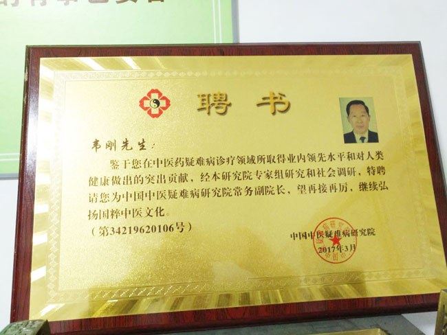 韦刚,2017年读完了《国际交流医科大学博士》学位,并被该大学聘为客座教授,因对高血压、偏瘫、支气管炎、结肠炎、乳腺炎、风湿痛、黄褐斑、中医美容、不育不孕、性功能障碍、牛皮癣、白癜风和癌肿的早期治疗疗效显著,受到国际社会认可,先后被世界卫生组织和斯里兰卡共和国总统授予《世界传统医学杰出贡献奖》和《世界传统医学终身成就奖》及《世界传统医学杰出名医奖》《世界传统医学金手指奖》及《世界健康大使》称号,韦刚博士现任中国(香港)中医高血压研究院院长;中国(香港)中医偏瘫研究院院长;中国(香港)中医不育不孕研究院院长;中国(香港)中医性功能障碍研究院院长;中国中医疑难病研究院常务副院长;香港华夏医药保健有限公司总裁;安徽省阜阳华夏高血压病医院院长等职。 韦刚博士对内科、中医科、皮肤科、儿科部分疑难杂症具有一定的研究。尤为值得人们敬仰的是他多年来对高血压、脑梗及其后遗症(中风偏瘫)、脑供血不足等病症有着他独到的见解和诊疗方法。在以往的医学实践中他总结出中西医相结合的诊治高血压的中药内服汤剂和足浴降压、降压茶、降压枕等配合针灸疗效尤为显著。经他治疗的部分高血压可终身不需服用降压西药,因此受到国际社会和我们国家卫生部认可,先后受到卫生部钱信忠部长和吕炳奎司长接见和亲笔提词,并授予奖章、奖杯、奖金、证书等。